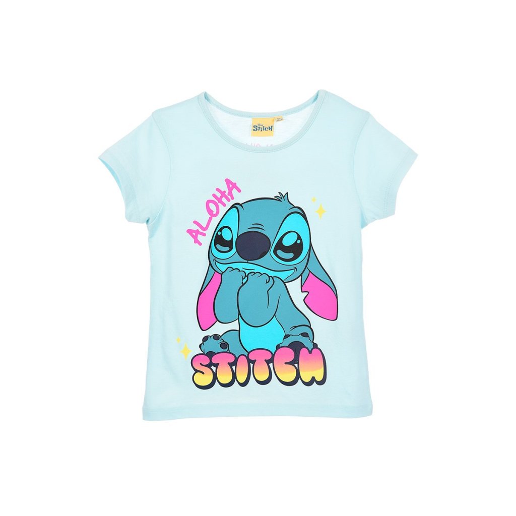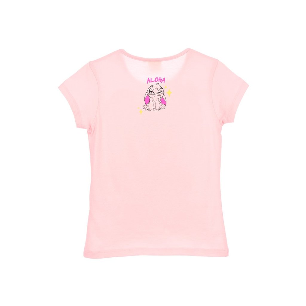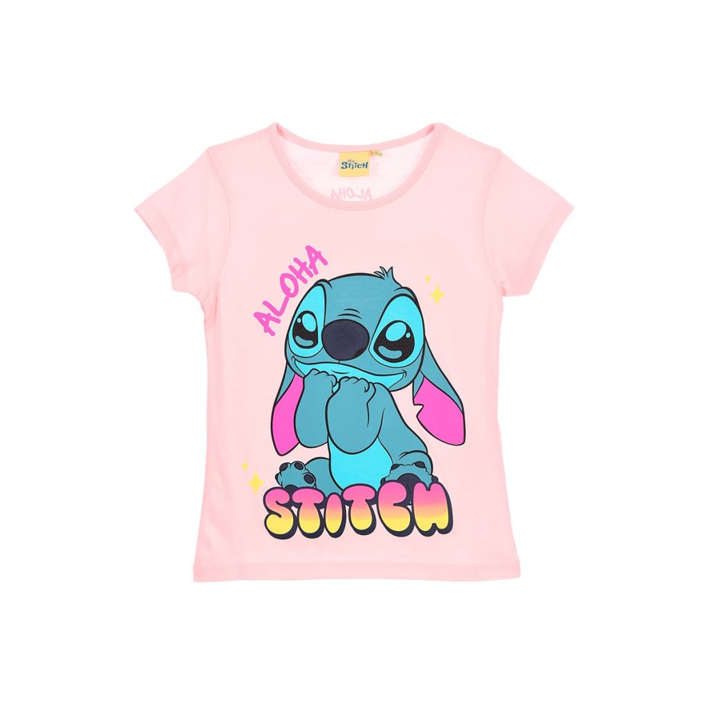 Camiseta Aloha Stitch de manga corta confeccionada en algodón y presentada en dos colores, azul y rosa. Tallas variadas de 3 a 8 años.