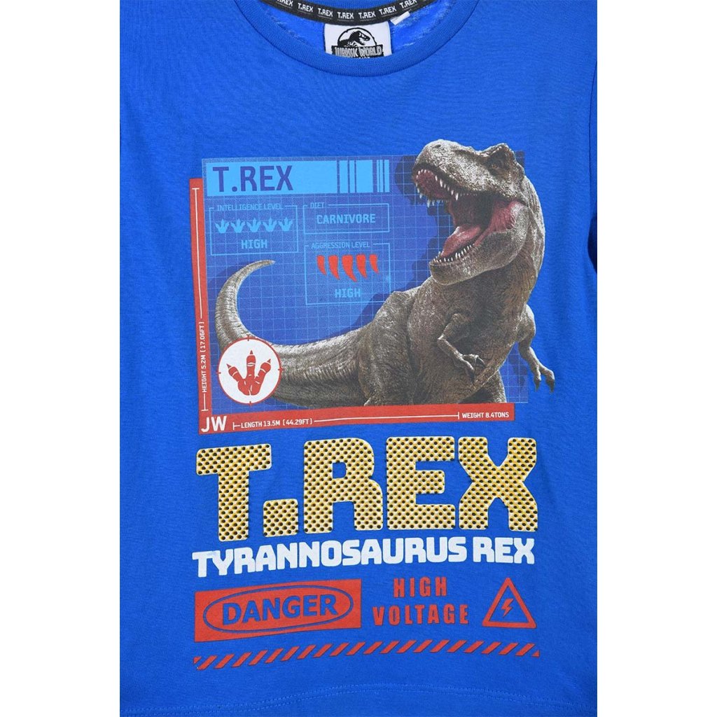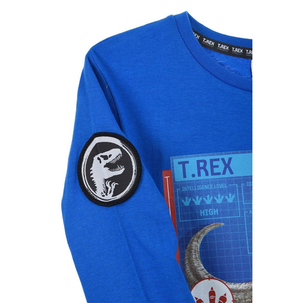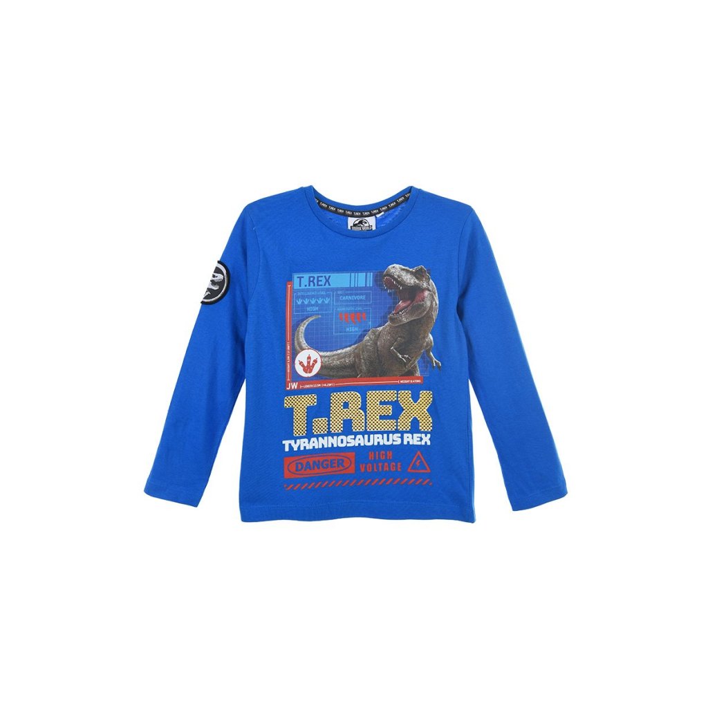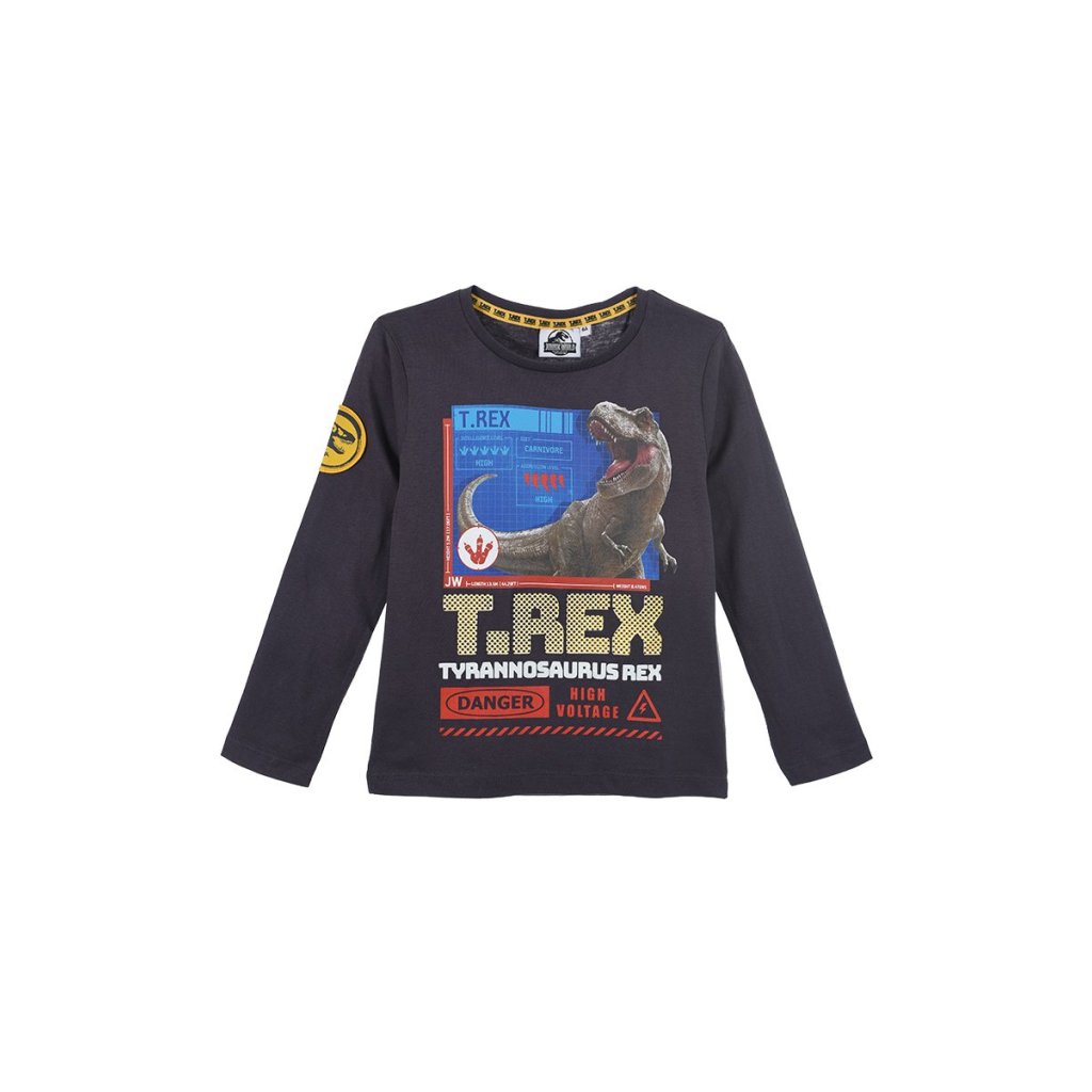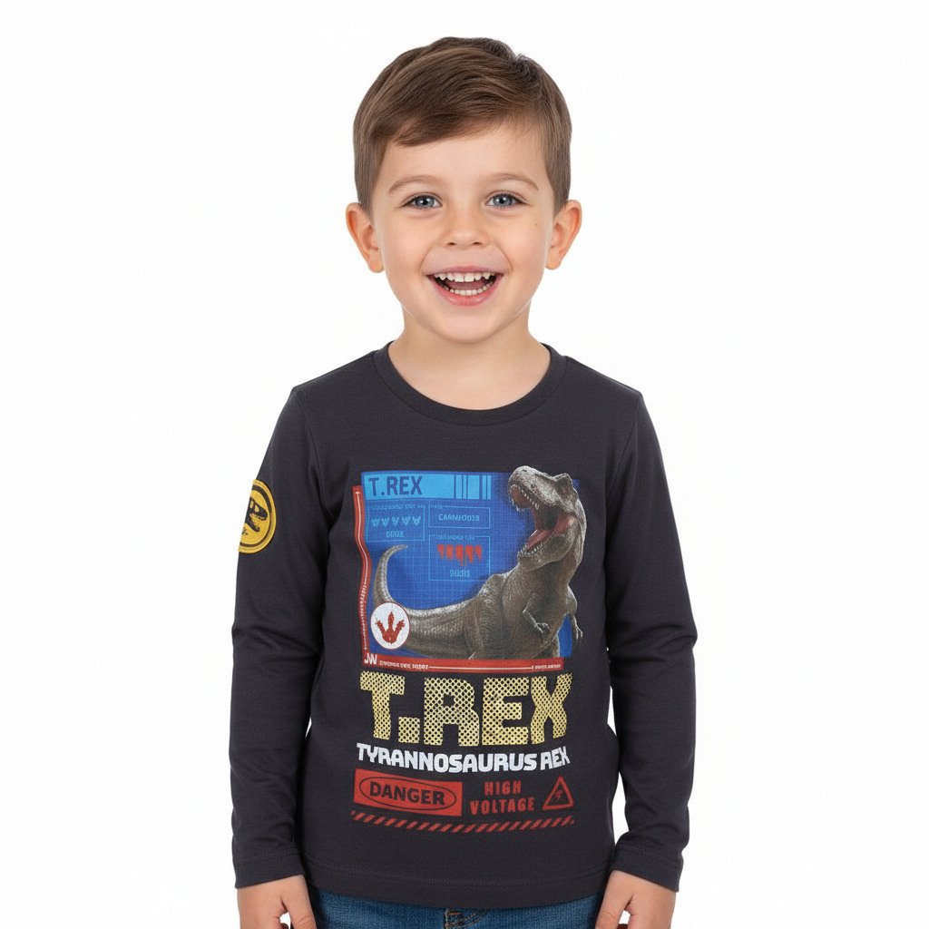 Camiseta manga larga T-Rex Jurassic World confeccionada en algodón y disponible en dos colores, azul y gris oscuro. Tallas de 3 a 8 años.