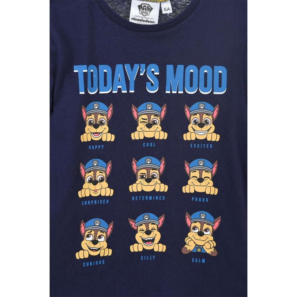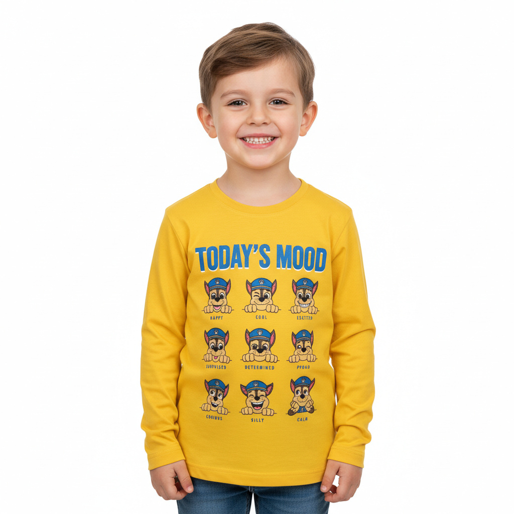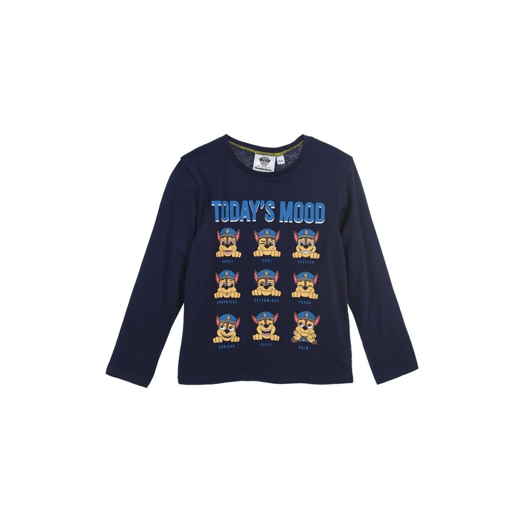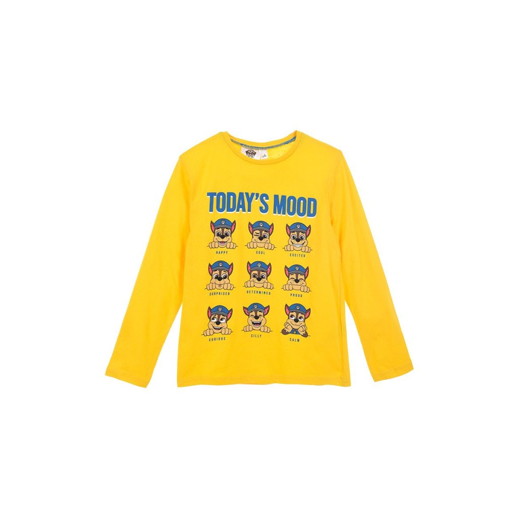 Camiseta manga larga con el mensaje Today´s Mood de paw patrol, confeccionada en algodón y disponible en dos colores, amarillo y azul marino. Tallas de la 3 a la 6.