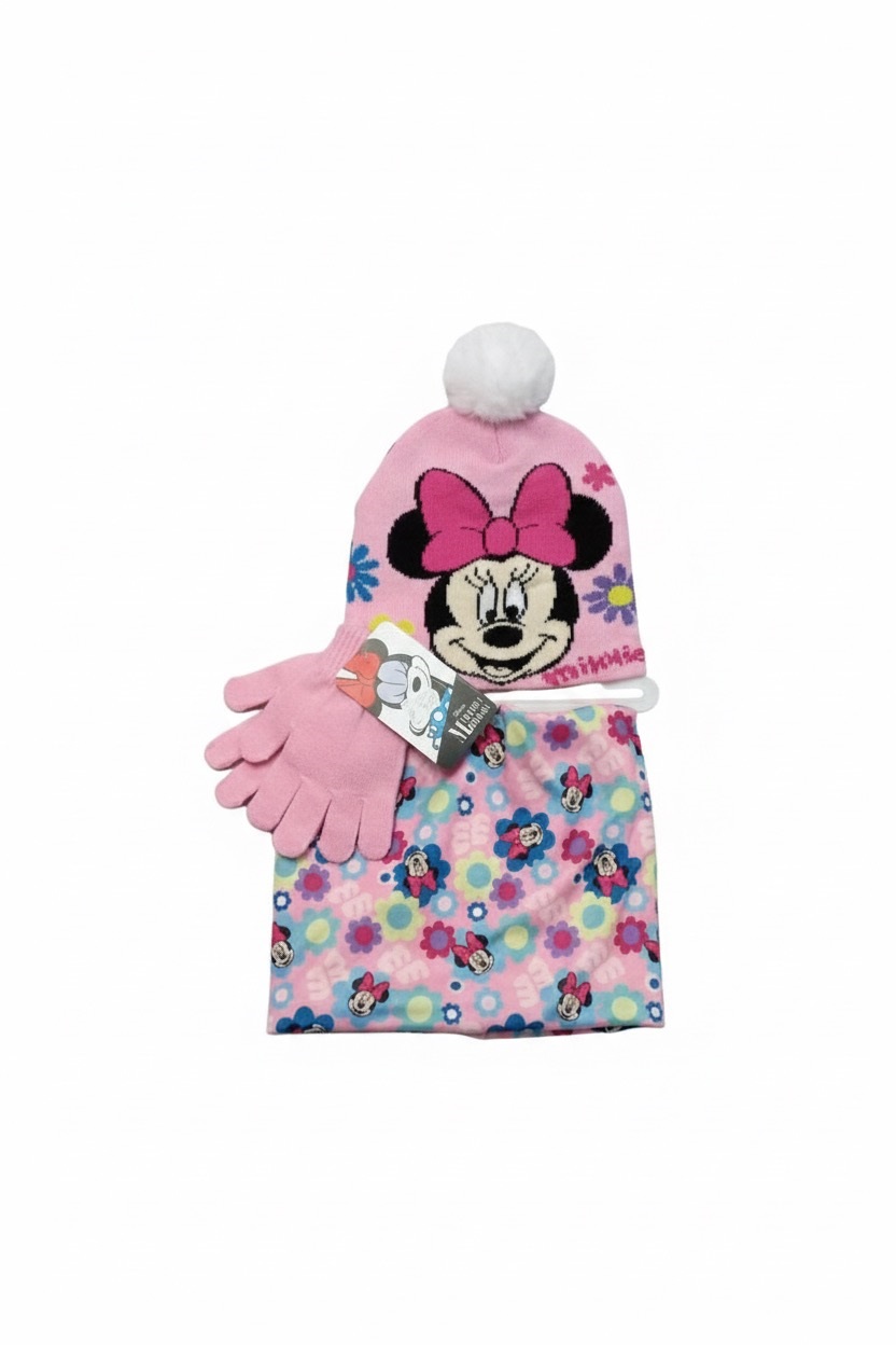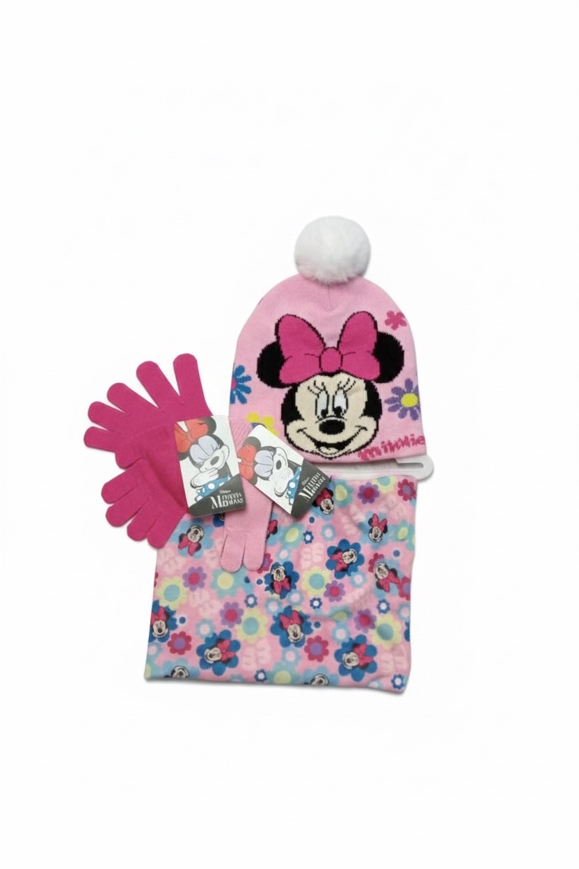 Conjunto de Minnie Mouse compuesto por braga de cuello, un gorro de punto con un divertido pompón y un par de guantes a juego. Disponible en dos colores.