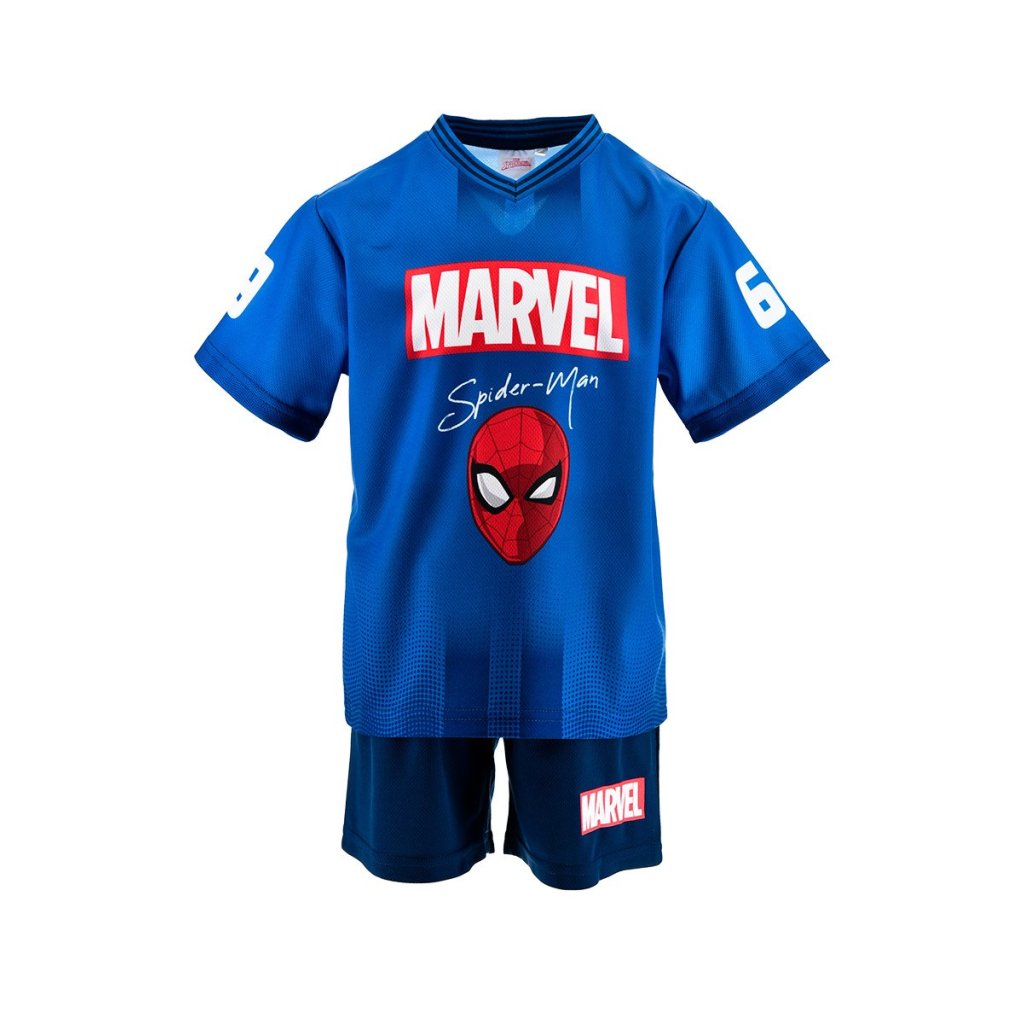 Conjunto de Spiderman de la colección Marvel fabricado el tejido transpirable de manga corta. Dos piezas con cintura elástica en el pantalón para mayor comodidad. Tallas de 3 a 8 años.