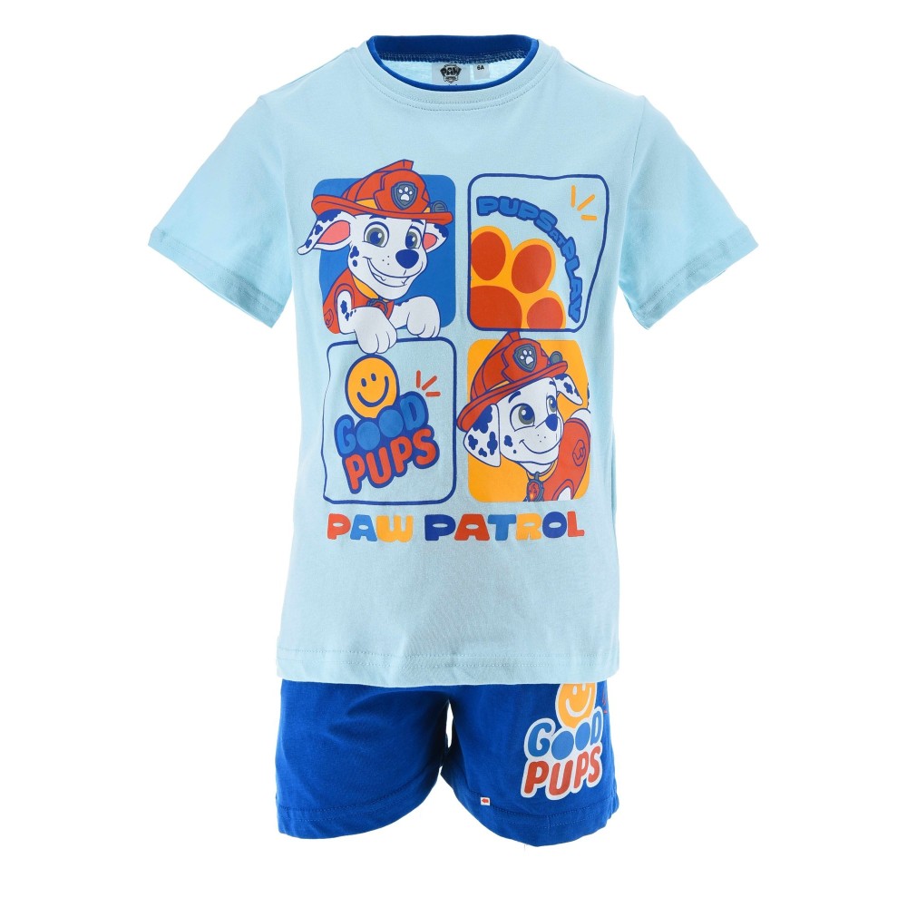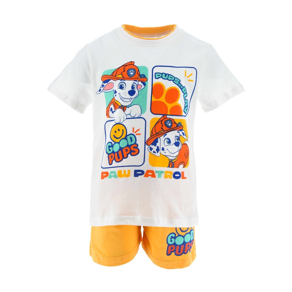 Conjunto de verano compuesto por pantalón y camiseta de manga corta, colección Patrulla Canina. Disponible en dos colores, amarillo y azul, en tallas desde la 3 a la 6.