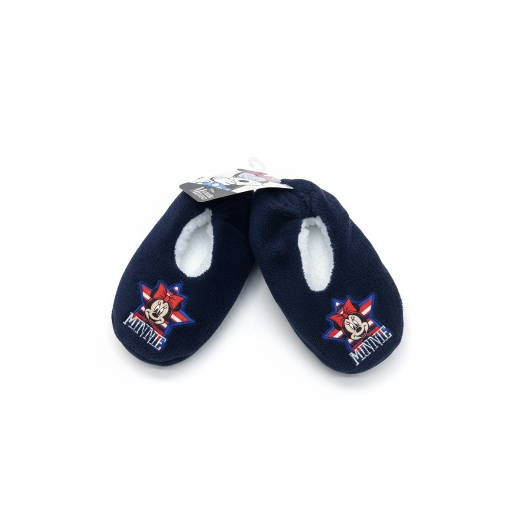 PANTUFLAS MINNIE MOUSE DISNEY son el complemento perfecto para mantener tus pies cálidos y cómodos durante los meses más fríos. Estas encantadoras pantuflas Minnie Mouse Disney, parte de la exclusiva colección Disney, están diseñadas pensando en los fans de Minnie Mouse, ofreciendo un estilo divertido y una suavidad inigualable. Ideal para el invierno, su diseño presenta a Minnie Mouse bordada sobre una estrella con detalles en rojo, blanco y azul, destacando en un vibrante fondo azul marino. El interior, forrado en un suave tejido borreguito blanco, asegura una sensación acogedora en cada paso.