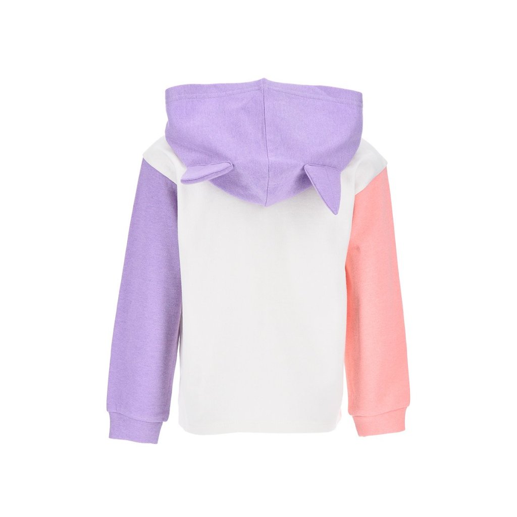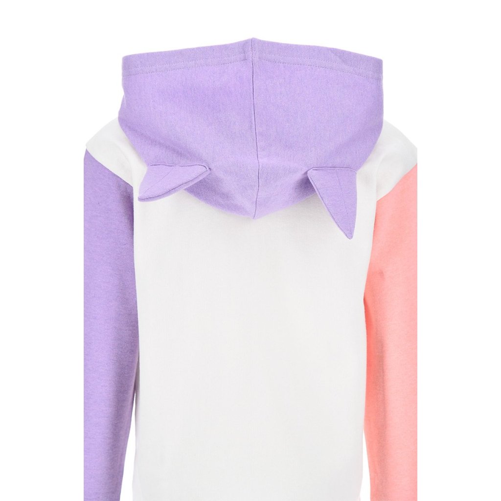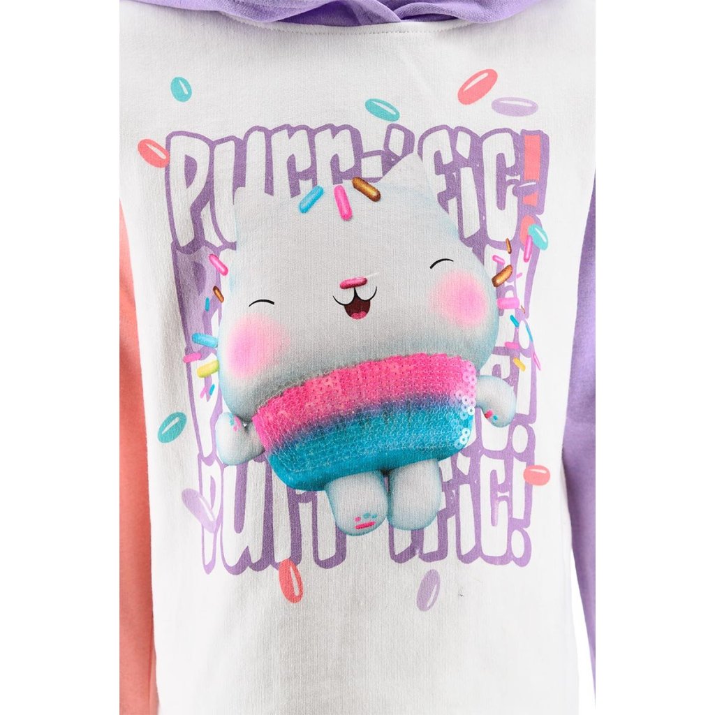 Sudadera con capucha de la colección de Gabbys Dollhouse presentada en dos colores, con manga morada y manga rosa. Orejitas en la capucha. Tallas 3 a 8 años.