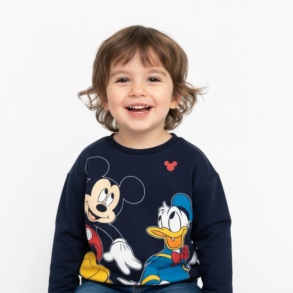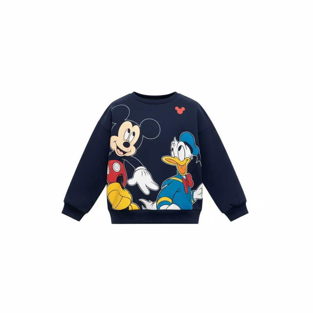 ¡Mira qué sonrisa! La SUDADERA INFANTIL MICKEY es perfecta para los pequeños aventureros. Su vibrante color azul marino sirve de fondo ideal para los dibujos a todo color de Mickey Mouse y el Pato Donald, que parecen cobrar vida con sus expresiones alegres. Un detalle encantador es el pequeño icono de Mickey en rojo cerca del cuello. Esta sudadera no solo es cómoda, sino que también llena de alegría y diversión el armario de tu hijo, haciéndolo lucir adorable.